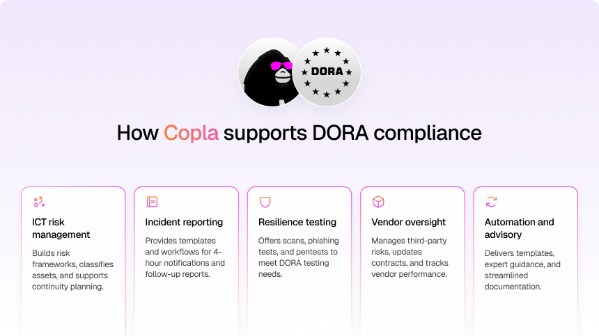 DORA compliance doesn’t have to drain your resources or slow down innovation. With Copla, you can transform regulatory pressure into an opportunity for operational excellence. Our platform simplifies the entire compliance lifecycle—from gap analysis and third-party risk management to TLPT coordination and board-ready reporting—so your team stays focused and audit-ready at all times.