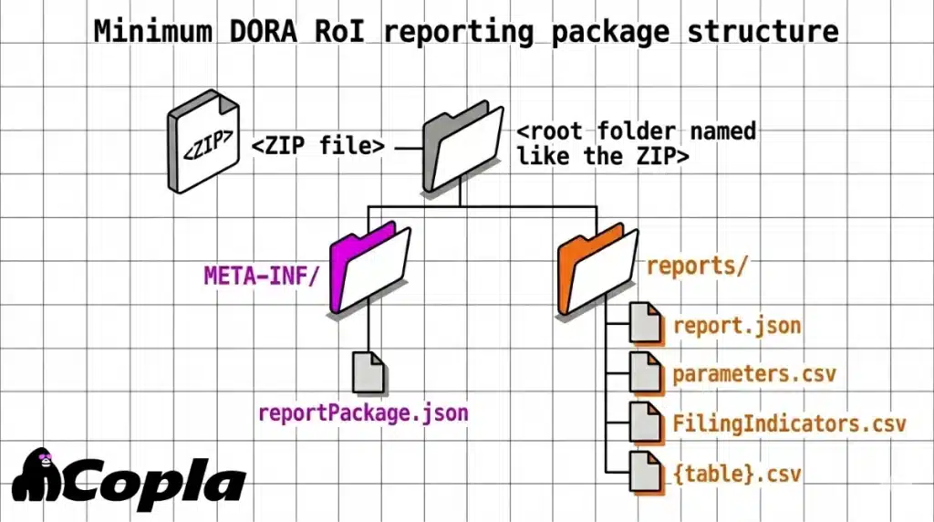 In DORA Register of Information (RoI) reporting, supervisors receive a structured reporting package — a ZIP with metadata and linked comma-separated values (CSV) files — not individual exported tables. The European Banking Authority’s (EBA) package guidance for preparing plain CSV reporting for DORA requires plain-csv, with eXtensible Business Reporting Language JSON (xBRL-JSON) metadata used for validation.