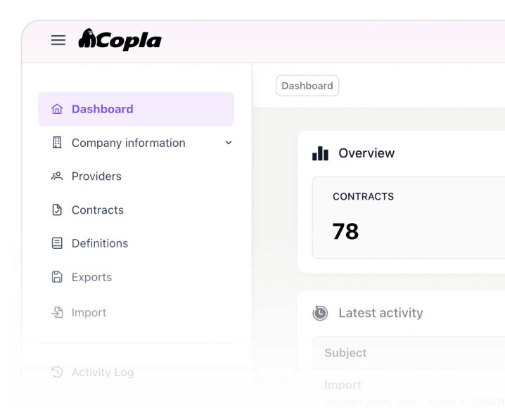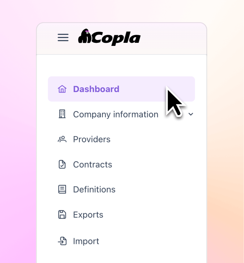 To use Copla Registry, enter your company information through the guided form, then add your ICT providers. Link contracts to each provider, including dates, scopes, and SLAs. Finally, select the reporting date and export the register in XML or CSV format for compliance.