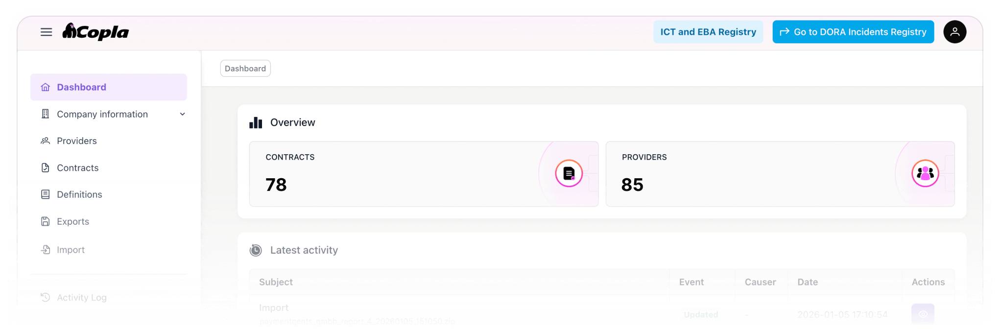 Copla Registry is a dedicated tool for maintaining and reporting ICT third-party data required by financial regulators across the EU. It focuses on structure, consistency, and validation of reporting data in environments where requirements and supervisory expectations evolve over time.