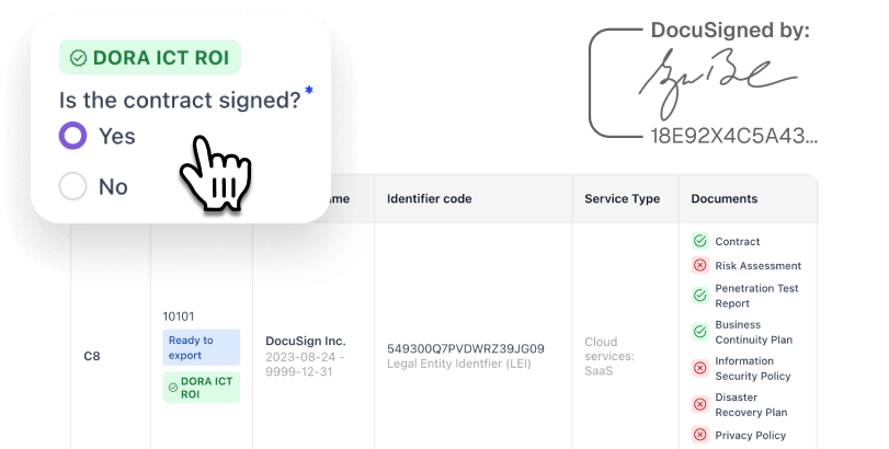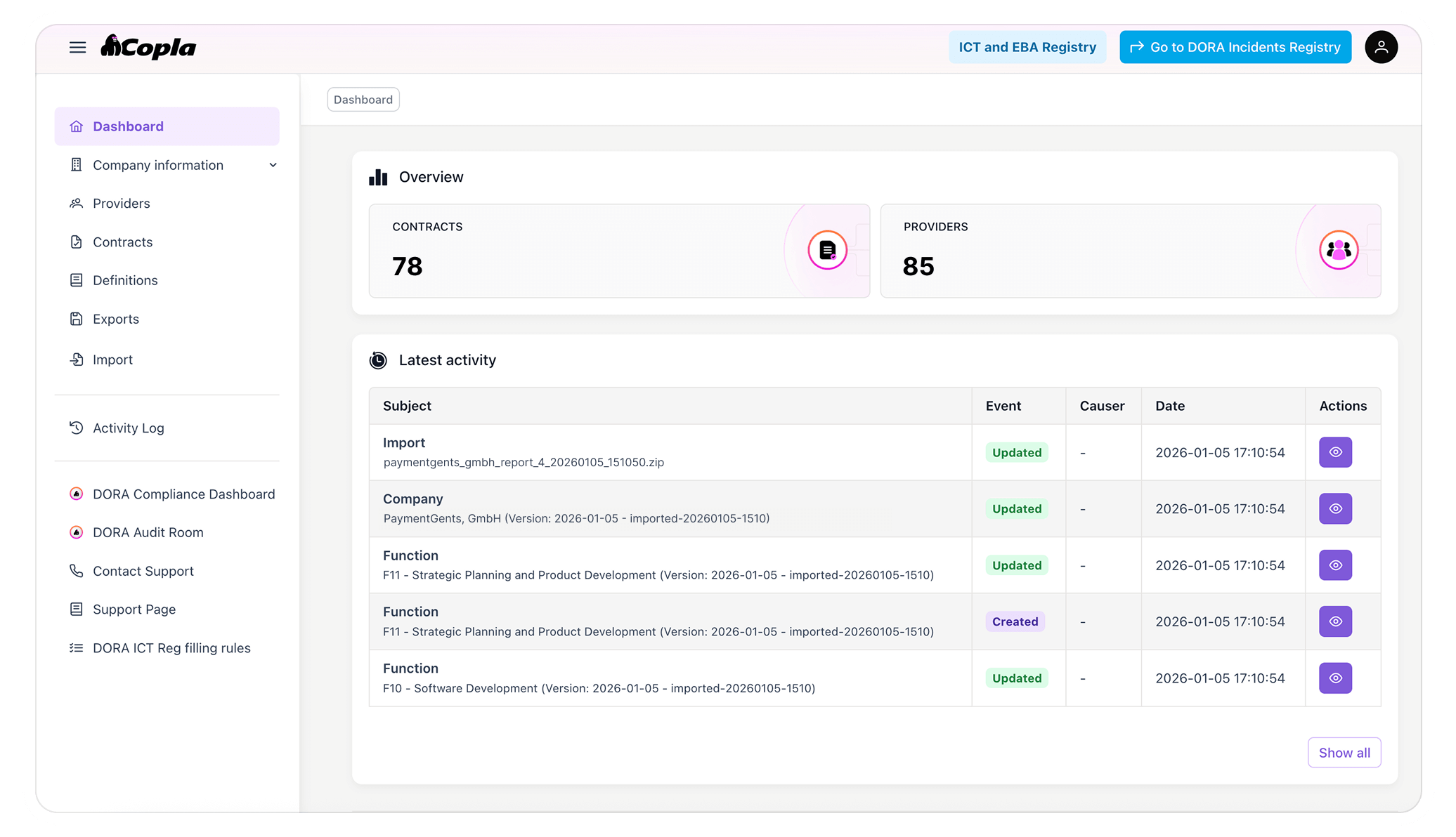 The DORA Register of Information must be maintained and regularly updated. Specific deadlines depend on your institution's reporting cycle and regulatory guidelines. Financial institutions must ensure they meet these deadlines to avoid penalties. To stay ahead of the deadlines, Copla helps you manage updates efficiently and stay compliant with real-time reporting capabilities.