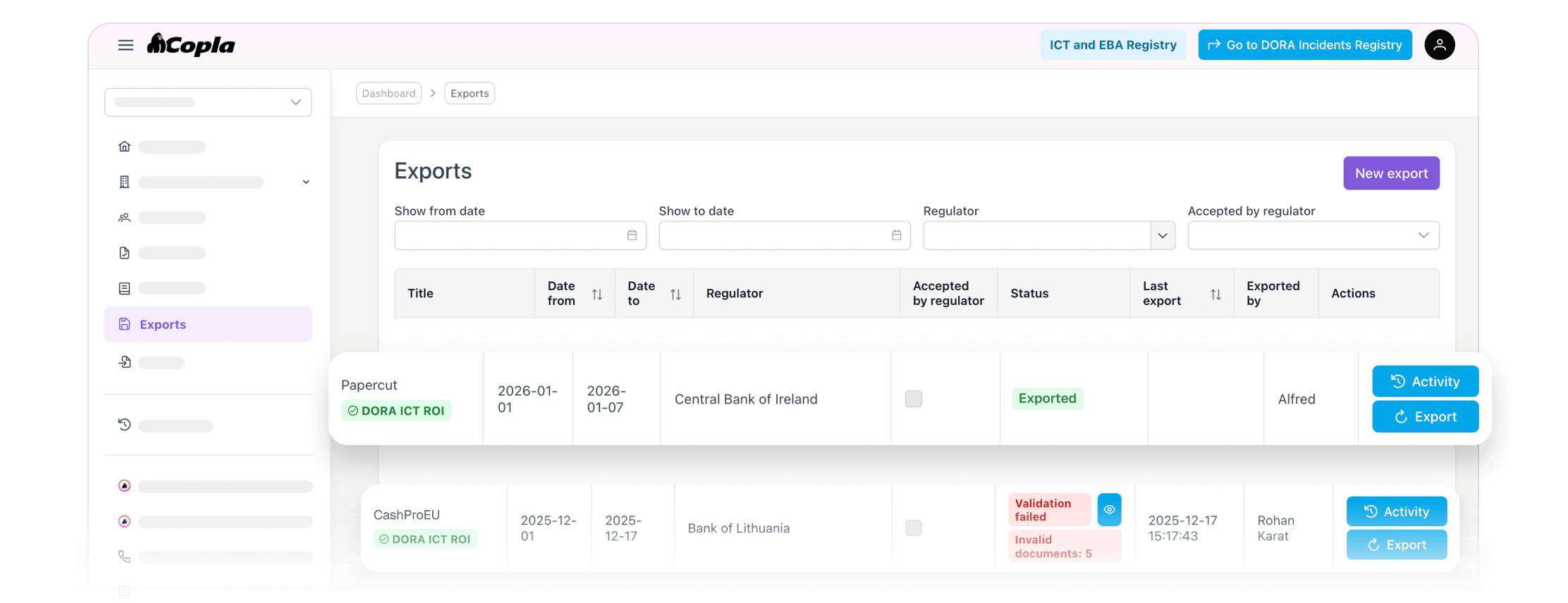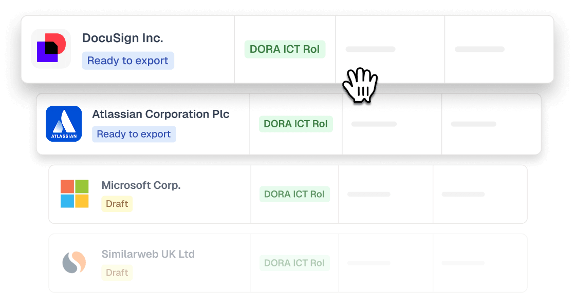 While you can find various DORA Register of Information templates in Excel format, for a more efficient and error-free experience, we recommend using Copla's automated Registry. It supports Excel and xBRL-CSV exports while providing an optimized workflow to maintain compliance without the complexity of manual spreadsheets.