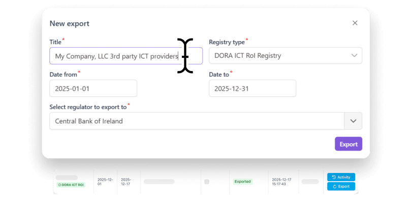 The DORA Register of Information reporting process involves maintaining a detailed inventory of ICT third-party providers, including contract details, business functions, service criticality, and risk assessments. Financial institutions must regularly update this register to ensure compliance with the DORA. For ease and accuracy, Copla offers a streamlined tool to automate this process and ensure your reports are fully compliant.
