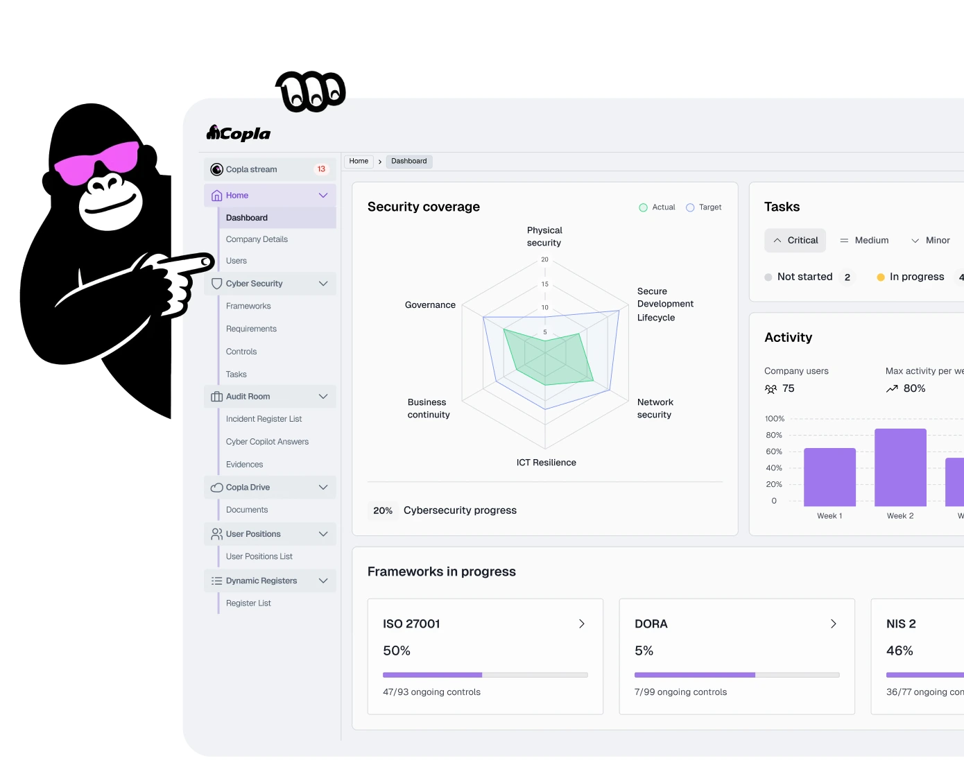 DORA, NIS2, ISO 27001 — native to the platform, with particular depth in regulated industries.
