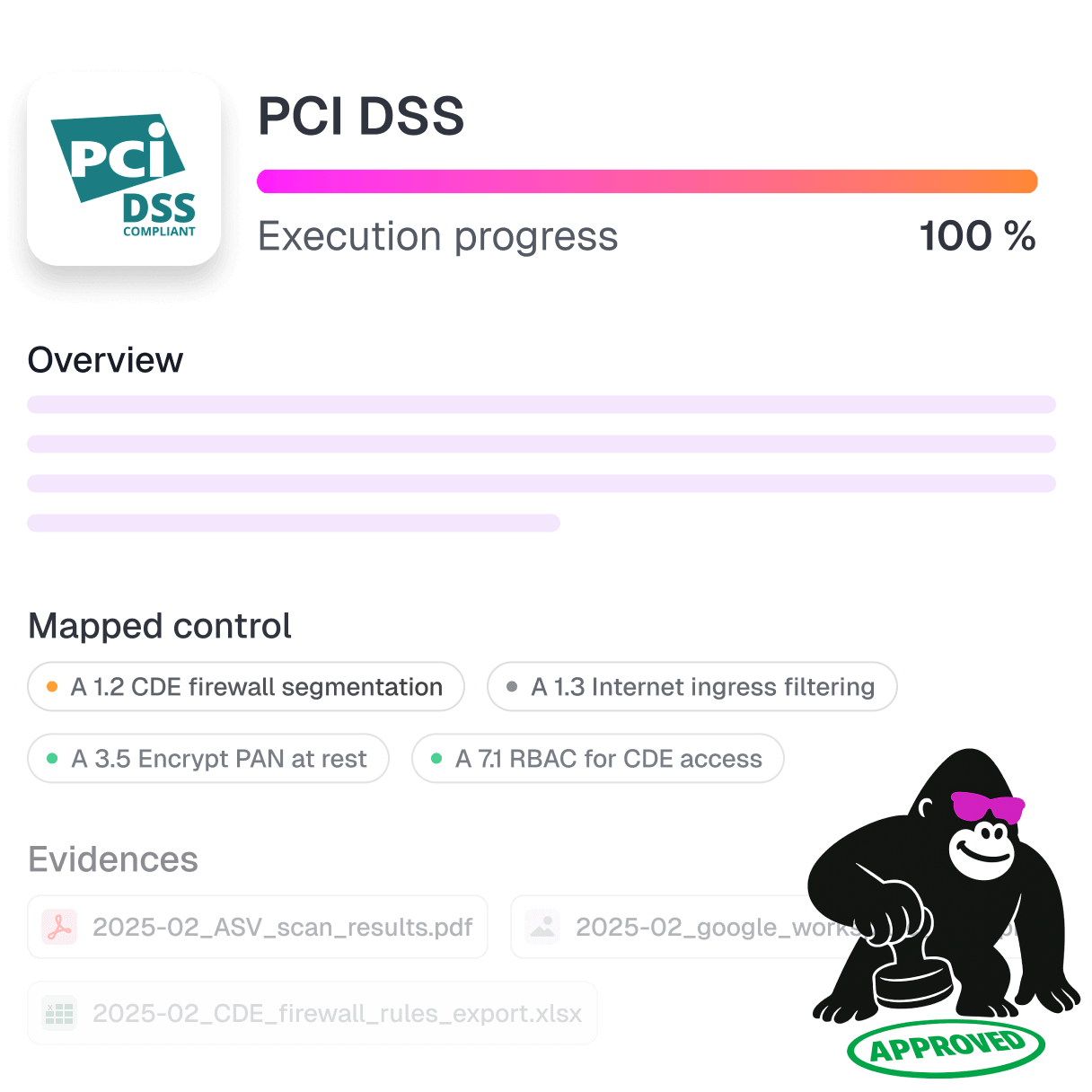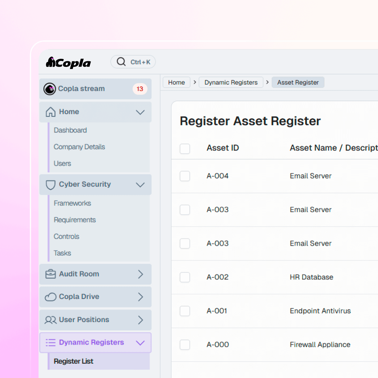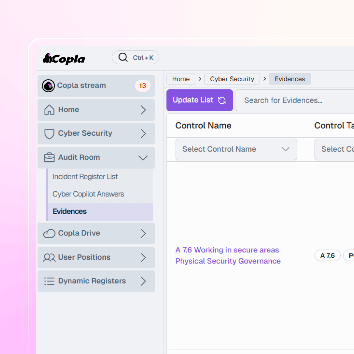 Copla orchestrates and guides teams to provide the right evidence and linking it directly to each requirement. IT assigns tasks, captures evidence automatically, and keeps your team on track across all PCI DSS control areas, ensuring nothing is missed and your organisation stays continuously audit-ready.