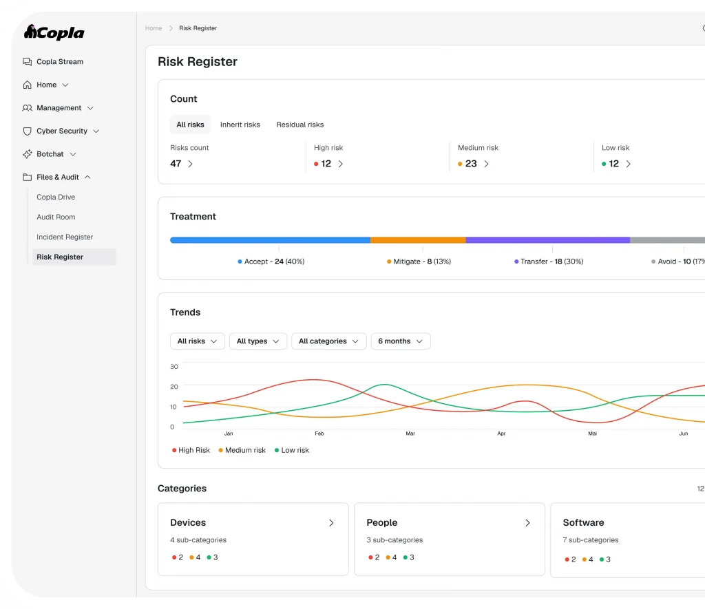 Copla builds your risk register from your actual environment and keeps it continuously updated